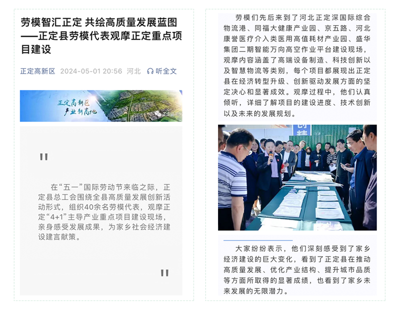 為了積極弘揚勞模精神,迎接“五一”國際勞動節的到來,正定縣總工會組織縣內40余名勞模代表,實地觀摩正定“4+1”主導產業重點項目建設現場,切身感受近年來正定縣的發展新變化。康譽醫療介入類醫用高值耗材產業園作為受訪項目之一,進行了熱情接待和詳細的講解。新聞媒體正定高新區、正定發布(官方微信公眾號)對此次活動進行了相關報道。