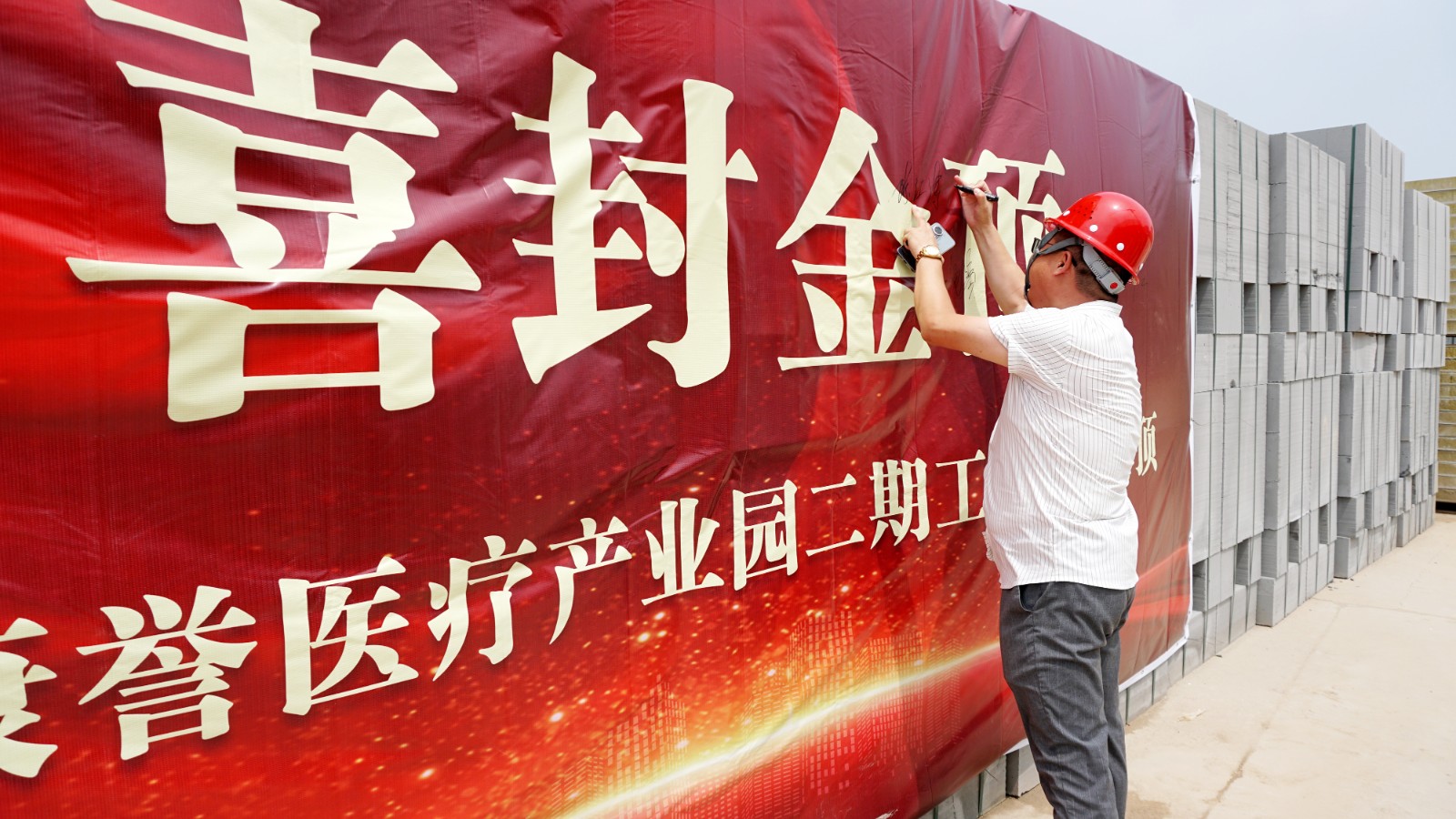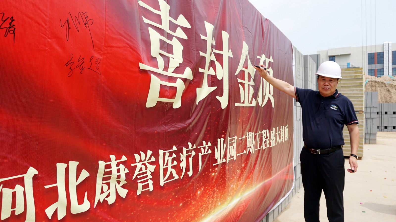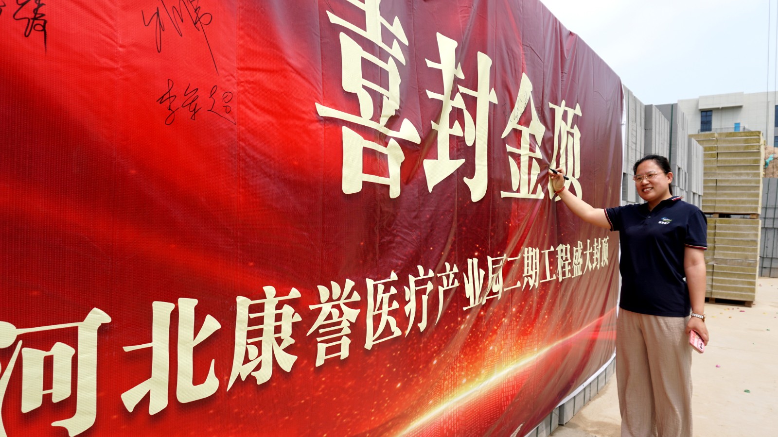在倒班樓封頂這一重要時刻,集團副總經理謝蘭廷、康譽醫療副總經理張艷琴攜工程部及施工單位主要管理團隊來到現場,共同見證這一激動人心的建設成果。領導們紛紛在簽名墻上簽名留念,與建設者們一起合影,用鏡頭定格這一載入園區發展史冊的珍貴瞬間。